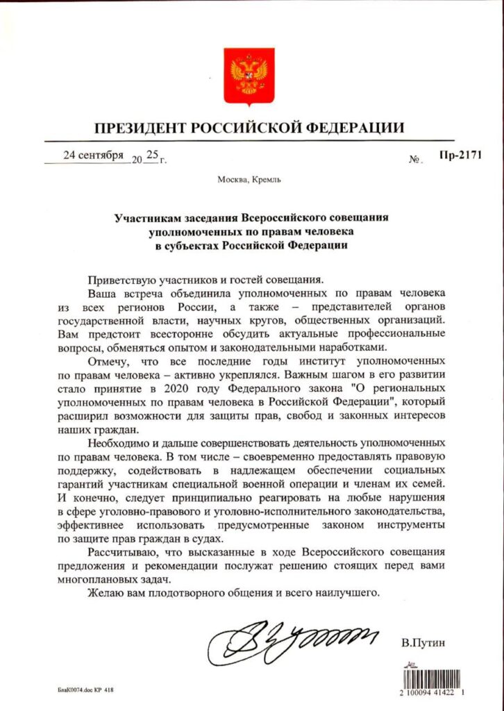 Президент России Владимир Владимирович Путин приветствовал участников Всероссийского совещания уполномоченных по правам человека в субъектах Российской Федерации и призвал принципиально реагировать на любые нарушения в сфере уголовно-правового и уголовно-исполнительного законодательства, эффективнее использовать предусмотренные законом инструменты по защите прав граждан в судах.